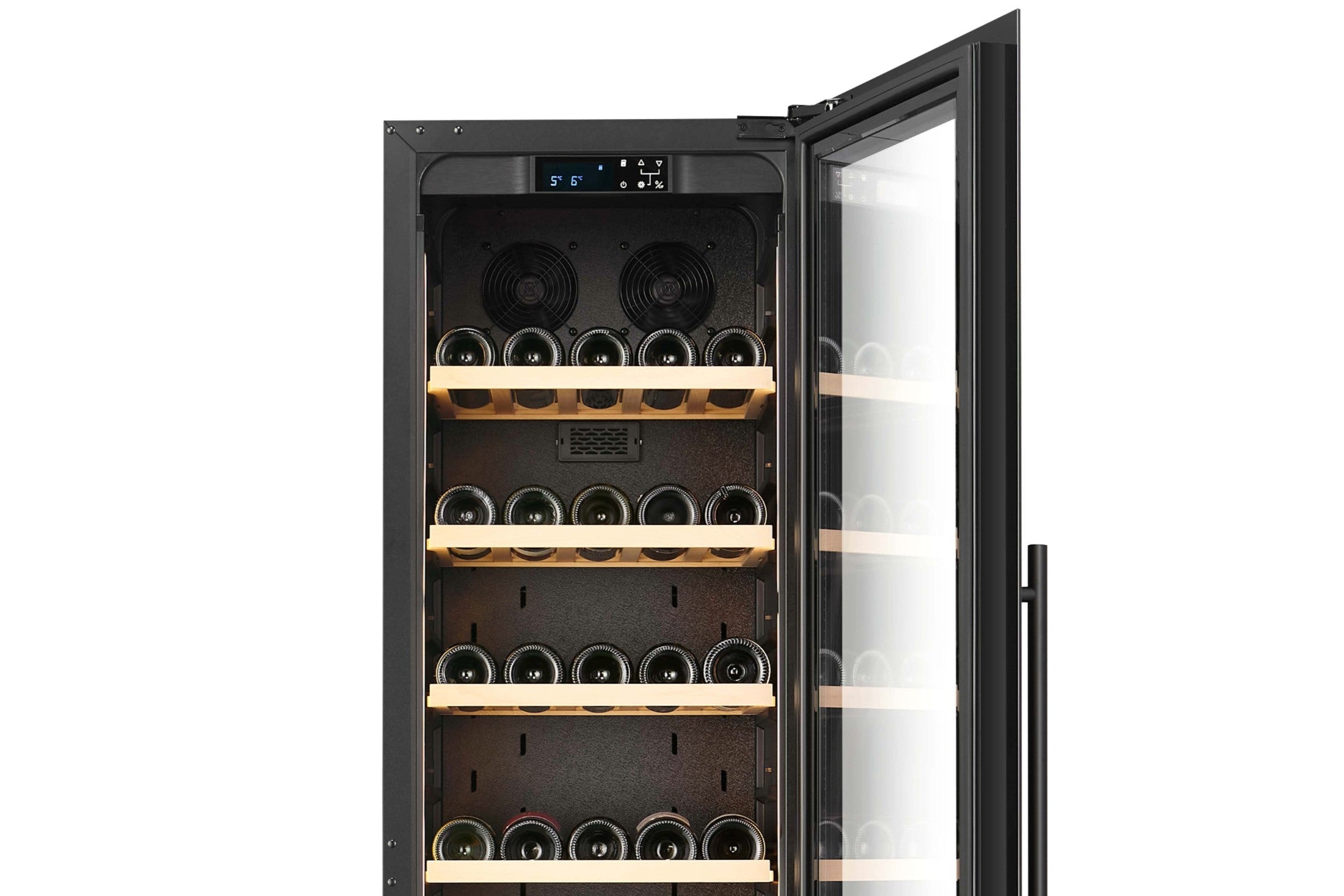 Con 2 películas UV aplicadas a la puerta, que reflejan los rayos UV de fuentes externas para evitar cualquier penetración en la botella de vino.
