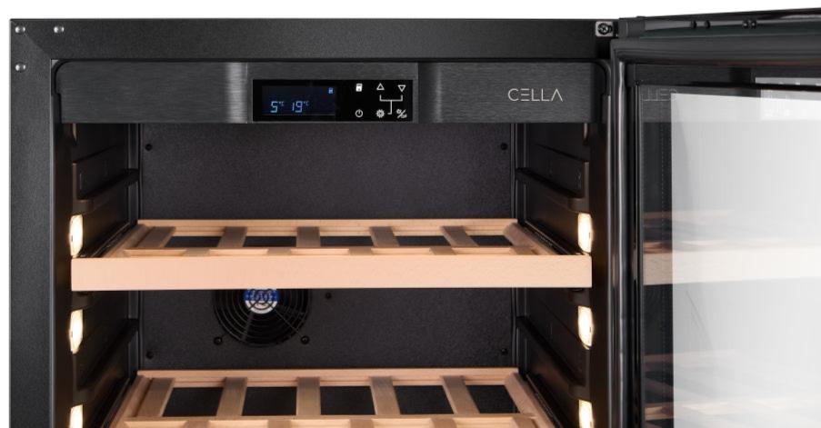 Los refrigeradores para vinos y bebidas CELLA cuentan con una nueva y actualizada pantalla táctil LCD que le permite cambiar la temperatura, la configuración de la luz, entre otras configuraciones; también hay un "bloqueo para niños" que se activa automáticamente para evitar que se cambie la temperatura.