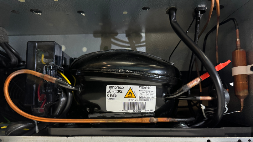 The compressor is mounted on rubber bushes to absorb any vibration and the shelves are manufactured from solid beech wood to absorb any internal vibrations.