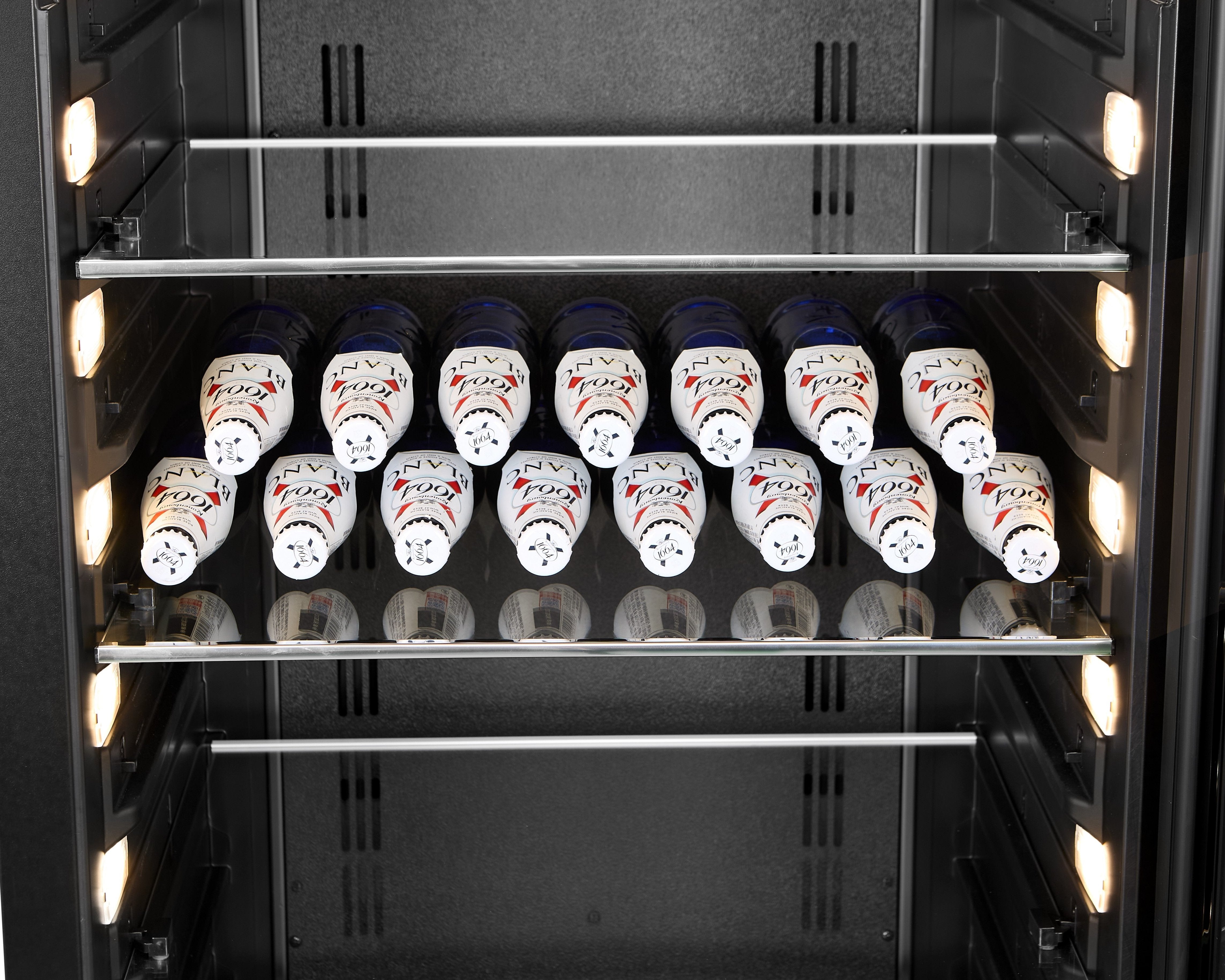 The wine side of the combination allows easy access to the bottles with extendable telescopic rails that pull 80% of the way out, the bottles sit neck to neck to achieve the maximum storage capacity and are suitable for both Bordeaux and Burgundy bottles.