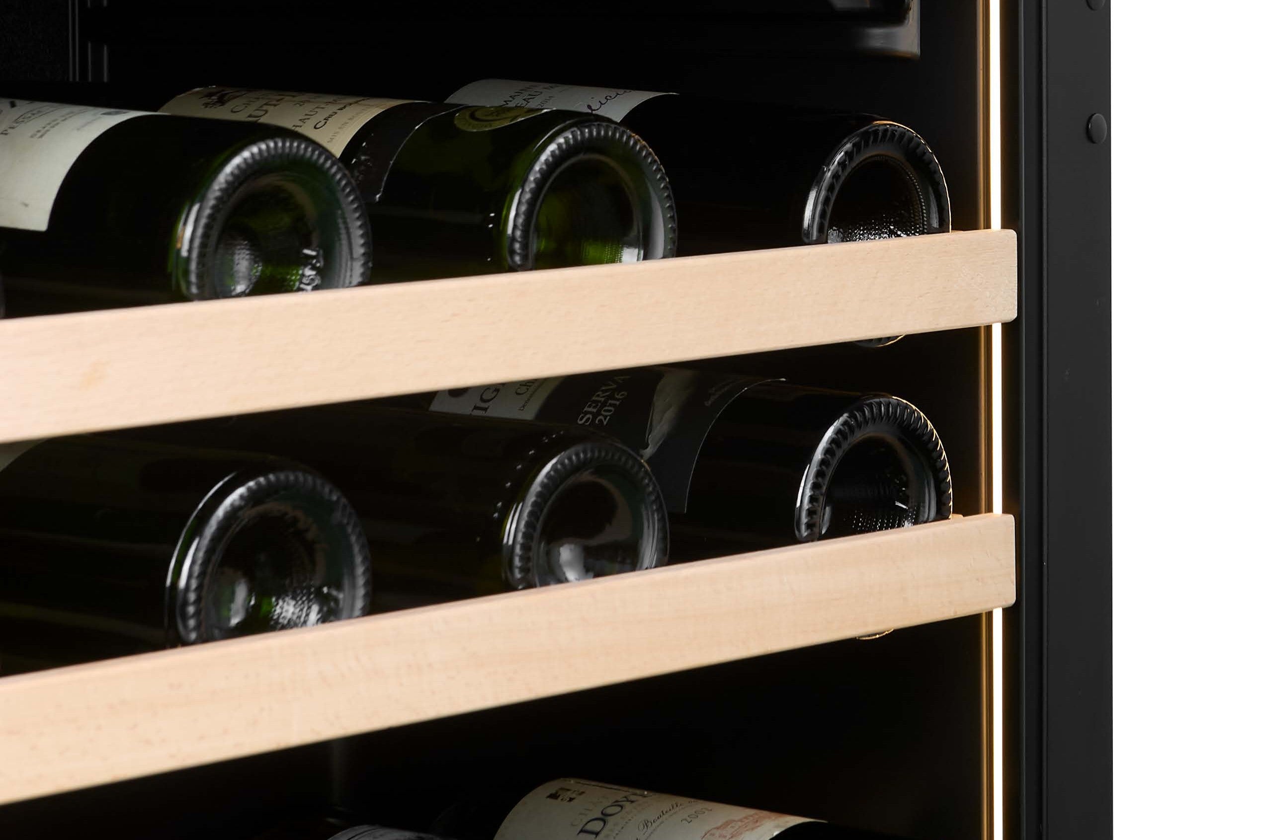Todos los modelos CELLA admiten botellas más grandes y anchas, de hasta 85 mm de diámetro, sin sacrificar espacio ni limitar el almacenamiento en los estantes a las botellas de Burdeos estándar.
